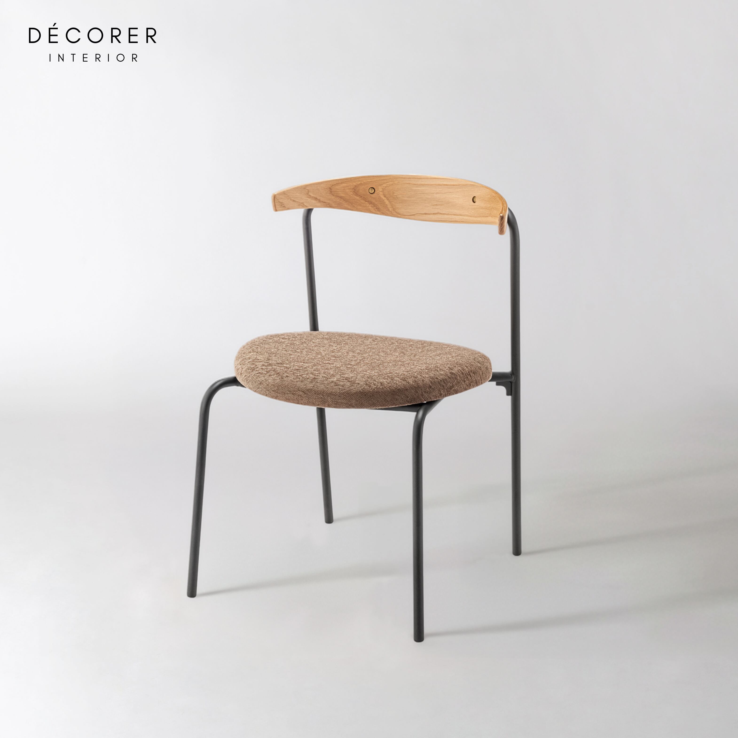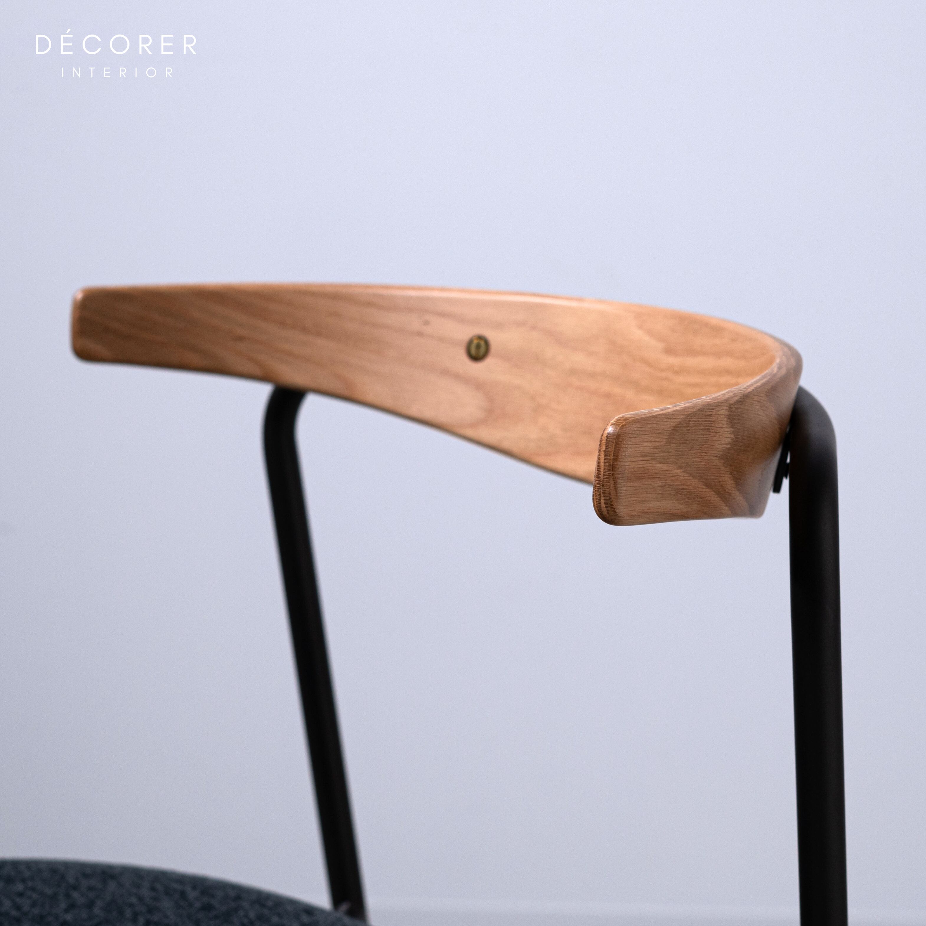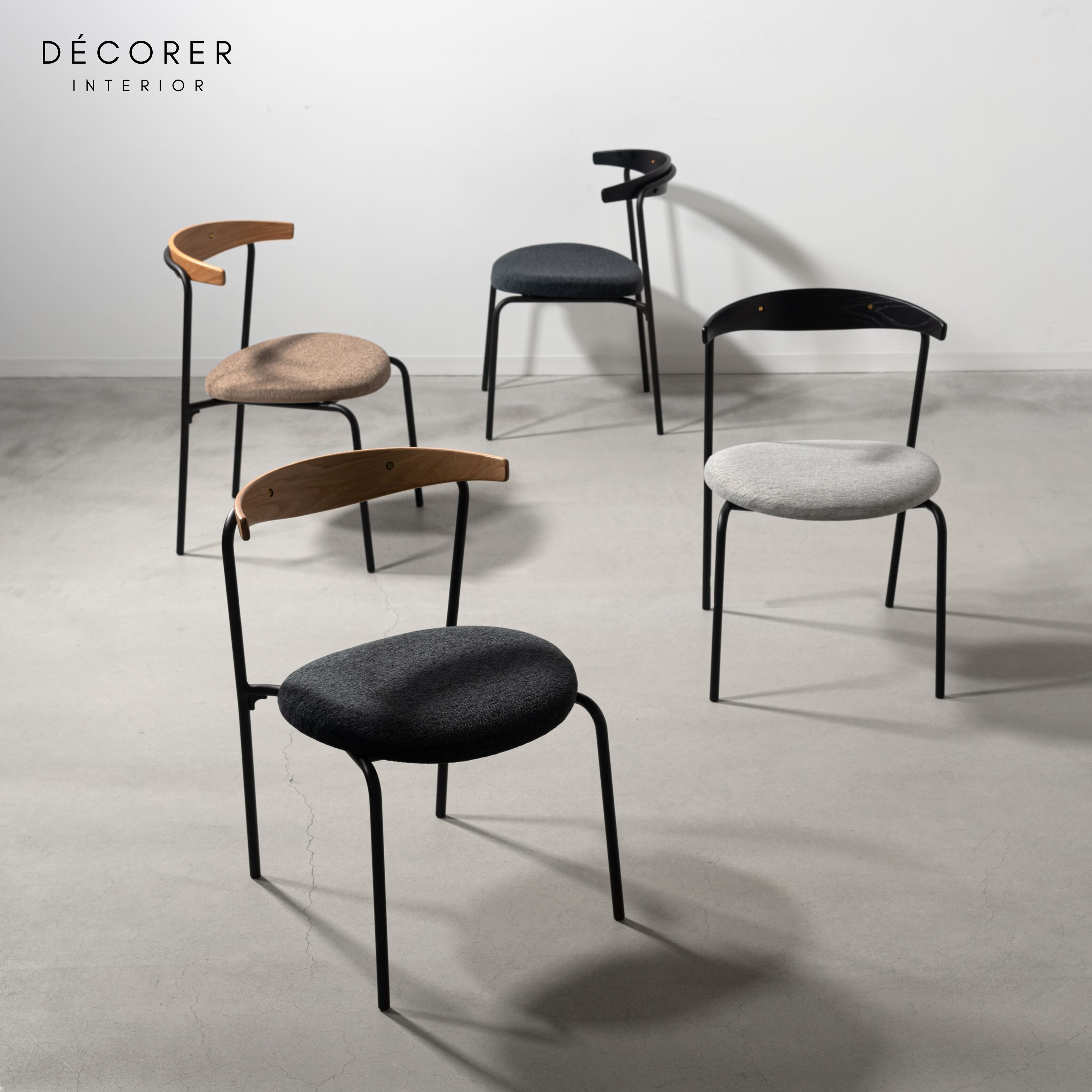 アーチ状に湾曲させた天然木の背もたれと、ファブリックを使用した座面に細身のスチール脚を組み合せ、スタイリッシュな雰囲気に仕上げたダイニングチェア。