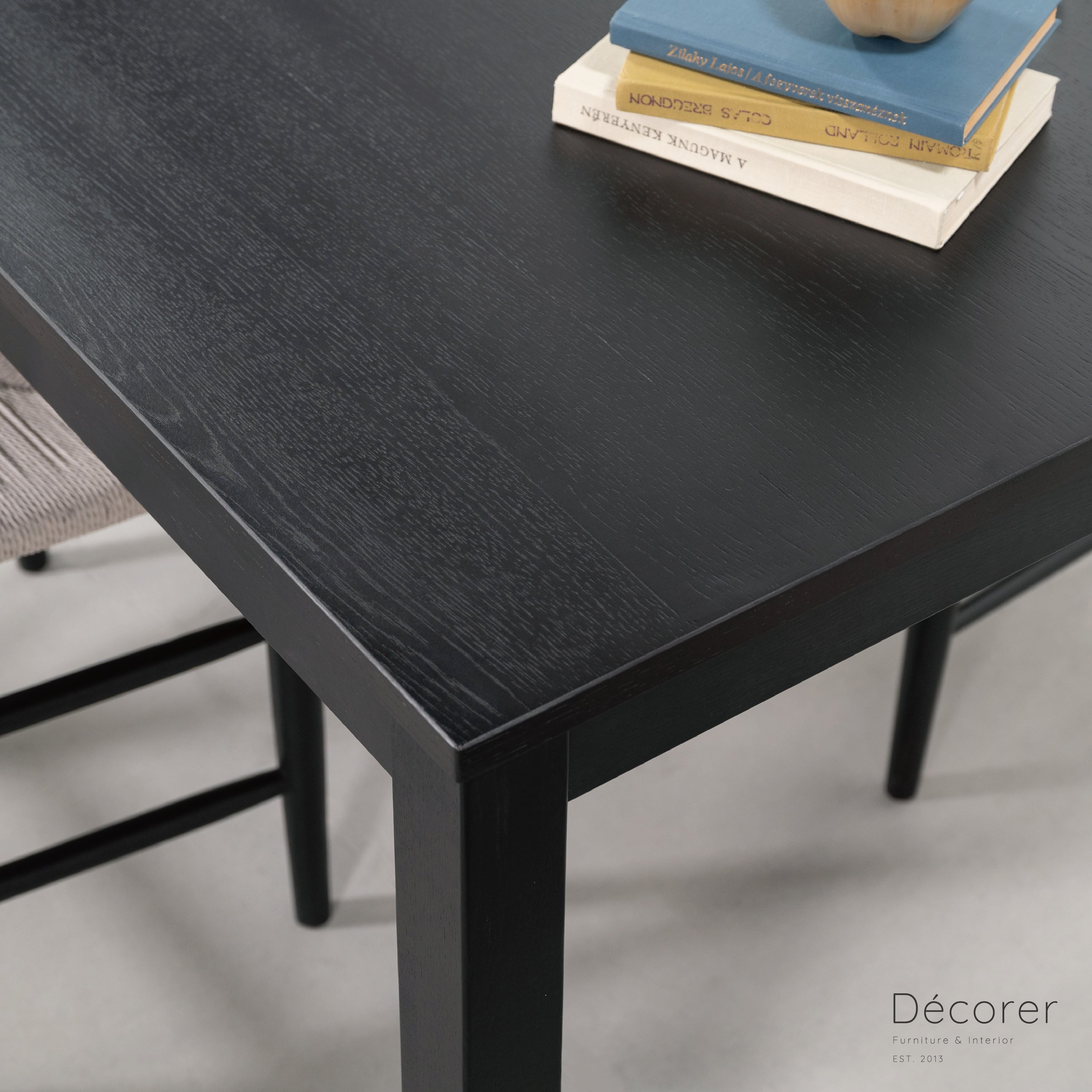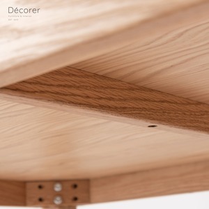 オークの木目が際立つ突板貼りの天板と、重厚感のあるオーク材の脚部が魅力。