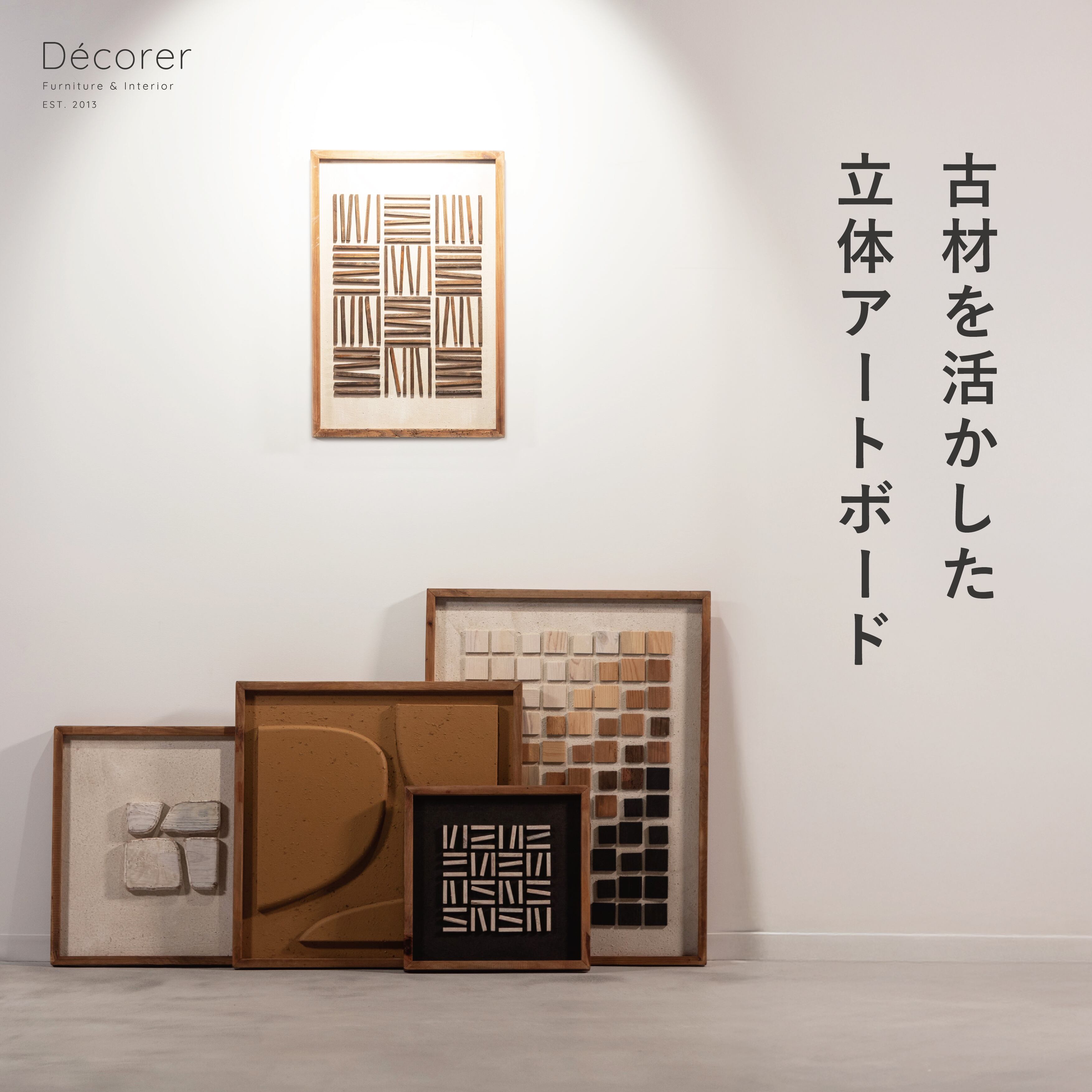 立体的に貼り付けられた古材や生地が存在感を放ちます。
